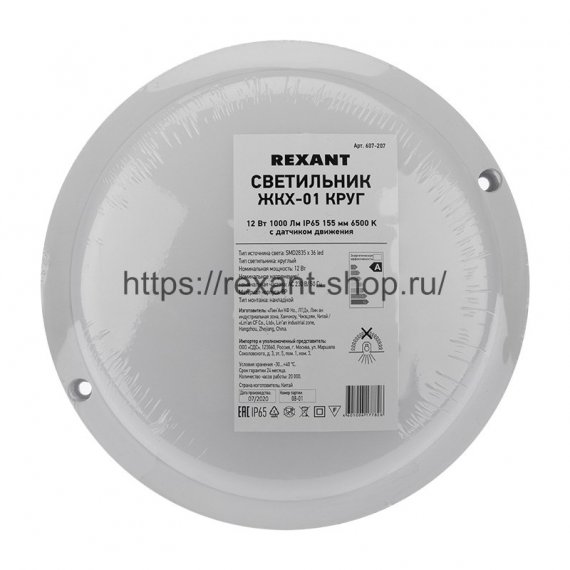 Светильник REXANT серии ЖКХ оснащен источником света типа SMD2835 с номинальной мощностью 12 Вт и световым потоком 1000 Лм.
