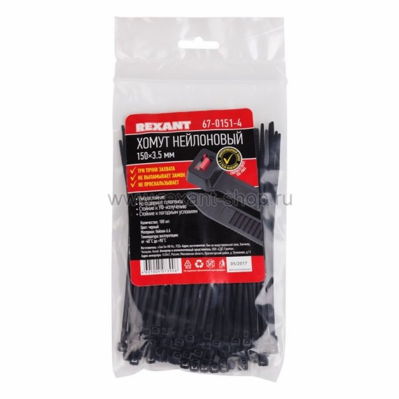 Хомут нейлоновый (кабельная стяжка) 150 х 3,6 мм чёрный "Тройной замок" предназначен для крепления или обвязки в жгут кабелей и проводов, крепления гибких гофротруб, а также других предметов к несущей поверхности или для соединения между собой. Используется при проведении электромонтажных работ, при монтаже структурированных кабельных систем, для бытовых нужд, а также в других отраслях народного хозяйства.