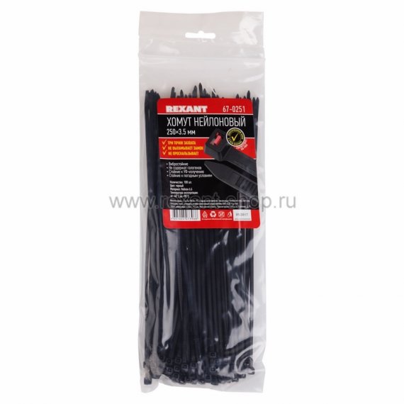 Хомут нейлоновый (кабельная стяжка) 250 х 3,6 мм чёрный "Тройной замок" предназначен для крепления или обвязки в жгут кабелей и проводов, крепления гибких гофротруб, а также других предметов к несущей поверхности или для соединения между собой. Используется при проведении электромонтажных работ, при монтаже структурированных кабельных систем, для бытовых нужд, а также в других отраслях народного хозяйства.