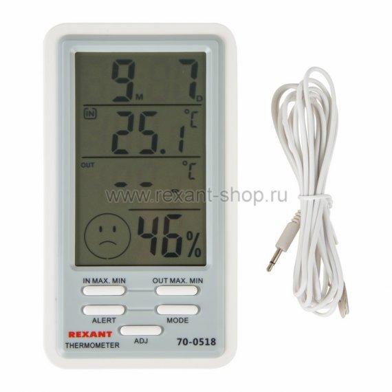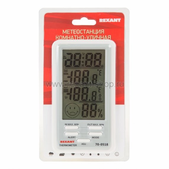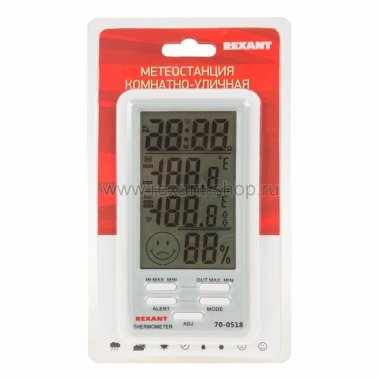Комнатно-уличная метеостанция REXANT это удобный, эффективный многофункциональный прибор для ежедневного мониторинга, внешних и внутренних температур и влажности воздуха в помещении. Ряд дополнительных функций: часы с секундной индикацией, будильник и демонстрация уровня общего уровня метеокомфорта в помещении делает её оптимальной для бытового использования дома, в офисе, отапливаемых складах, в учебных и медицинских учреждениях.