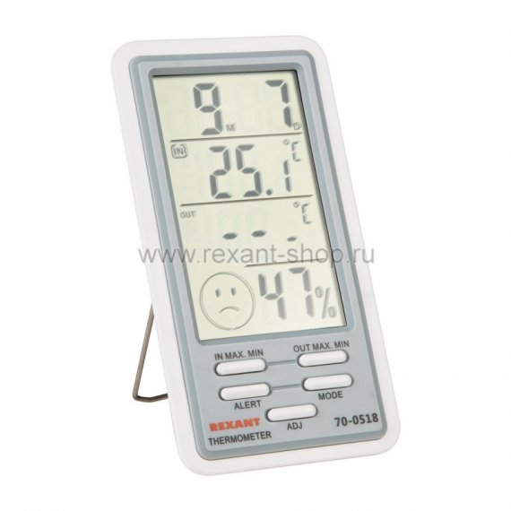 Комнатно-уличная метеостанция REXANT предназначена для измерения показаний температуры в помещении и на улице, комнатной влажности имеет часы, календарь и функцию будильника. Регистрирует в памяти максимальное и минимальное значения температур. Отображает общий уровень метеокомфорта в помещении. Имеет настольную подставку и отверстие для крепежа на стену и кнопку сброса параметров RESET.