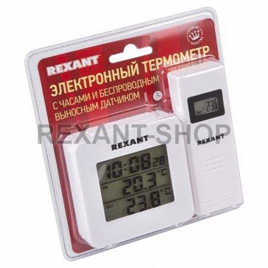 Электронный термометр с часами и беспроводным выносным датчиком предназначен для измерения показаний температуры внутри и снаружи помещения одновременно. Выносной датчик имеет монитор с показаниями значений температуры, и отверстие для крепежа на стену, что упрощает использование прибора в быту.