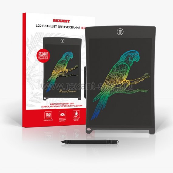 Планшет Rexant® 8,5 дюймов предназначен для фиксирования заметок и создания графических простейших рисунков. Он избавит от необходимости держать под рукой блокноты, бумагу для записей, переводить кучу бумаги на временные записи и покупать бесконечно альбомы для детских зарисовок.