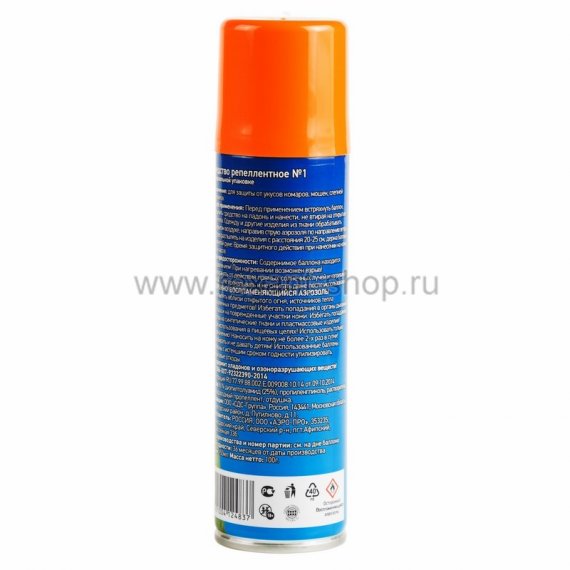 Способ применения: Перед применением встряхнуть баллон, распылить средство на ладонь и нанести не втирая на открытые части тела. Одежду и другие изделия из ткани обрабатывать на открытом воздухе, направив струю аэрозоля по направлению ветра. Средство распылять на изделия с расстояния 20-25 см, держа баллон в вытянутой руке. Время защитного действия при нанесении на кожу до 4-х часов.