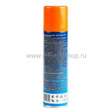 Меры предосторожности: распылять в отсутствии людей, животных, закрыв аквариумы, убрав пищевые продукты, кухонную утварь и детские игрушки! Содержимое баллона находится под давлением. При нагревании возможен взрыв! Предохранять от действия прямых солнечных лучей и нагревания выше 40° С. Не прокалывать и не сжигать даже после использования!