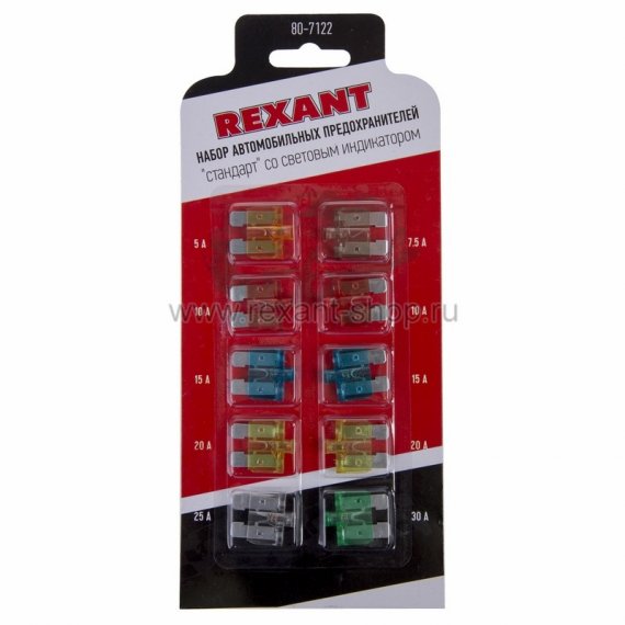 Набор автомобильных предохранителей "стандарт" со световым индикатором в блистере REXANT
