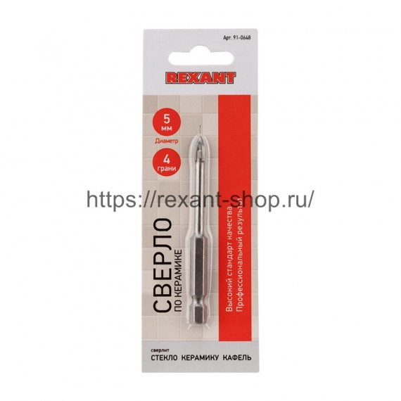 Rexant Сверло по стеклу и керамике 5 мм 4 грани шестигранный хвостовик, 91-0648 Rexant 91-0648