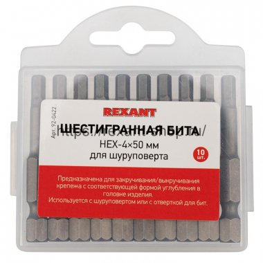 Купить по низким ценам Rexant 92-0422 Описание Rexant 92-0422 Бита HEX-4*50 мм (насадка) для закручивания крепежа (шурупы, винты). Произведена из стали S2 и закалена до оптимальной твердости, чем обусловлен высокий ресурс. Шестигранный хвостовик (Е6,3) обеспечивает быструю и надежную фиксацию в шуруповертах. Также используется с отверткой для бит