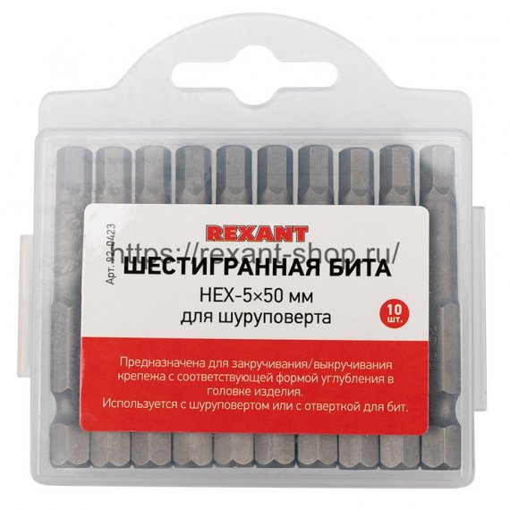 Купить по низким ценам Rexant 92-0423 Описание Rexant 92-0423 Бита HEX-5*50 мм (насадка) для закручивания крепежа (шурупы, винты). Произведена из стали S2 и закалена до оптимальной твердости, чем обусловлен высокий ресурс. Шестигранный хвостовик (Е6,3) обеспечивает быструю и надежную фиксацию в шуруповертах. Также используется с отверткой для бит