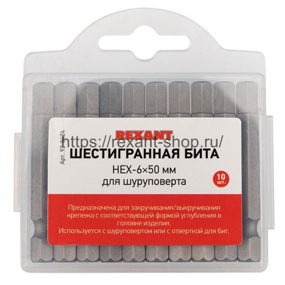 Купить по низким ценам Rexant 92-0424 Описание Rexant 92-0424 Бита HEX-6*50 мм (насадка) для закручивания крепежа (шурупы, винты). Произведена из стали S2 и закалена до оптимальной твердости, чем обусловлен высокий ресурс. Шестигранный хвостовик (Е6,3) обеспечивает быструю и надежную фиксацию в шуруповертах. Также используется с отверткой для бит