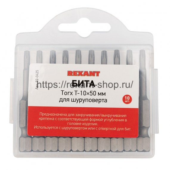 Купить по низким ценам Rexant 92-0425 Описание Rexant 92-0425 Бита Torx T-10*50 мм (насадка) для закручивания крепежа (шурупы, винты). Произведена из стали S2 и закалена до оптимальной твердости, чем обусловлен высокий ресурс. Шестигранный хвостовик (Е6,3) обеспечивает быструю и надежную фиксацию в шуруповертах. Также используется с отверткой для бит