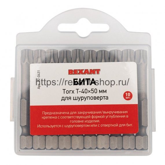 Купить по низким ценам Rexant 92-0431 Описание Rexant 92-0431 Бита Torx T-40*50 мм (насадка) для закручивания крепежа (шурупы, винты). Произведена из стали S2 и закалена до оптимальной твердости, чем обусловлен высокий ресурс. Шестигранный хвостовик (Е6,3) обеспечивает быструю и надежную фиксацию в шуруповертах. Также используется с отверткой для бит